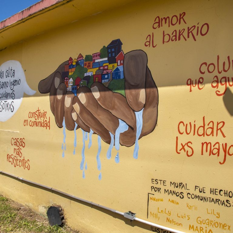 Este mural fue pintado por personas de la comunidad de Ingenio en Toa Baja y representa la unión de sus residentes ante las situaciones de riesgo que han vivido y presenta mensajes de cómo construir casas más seguras en comunidad.